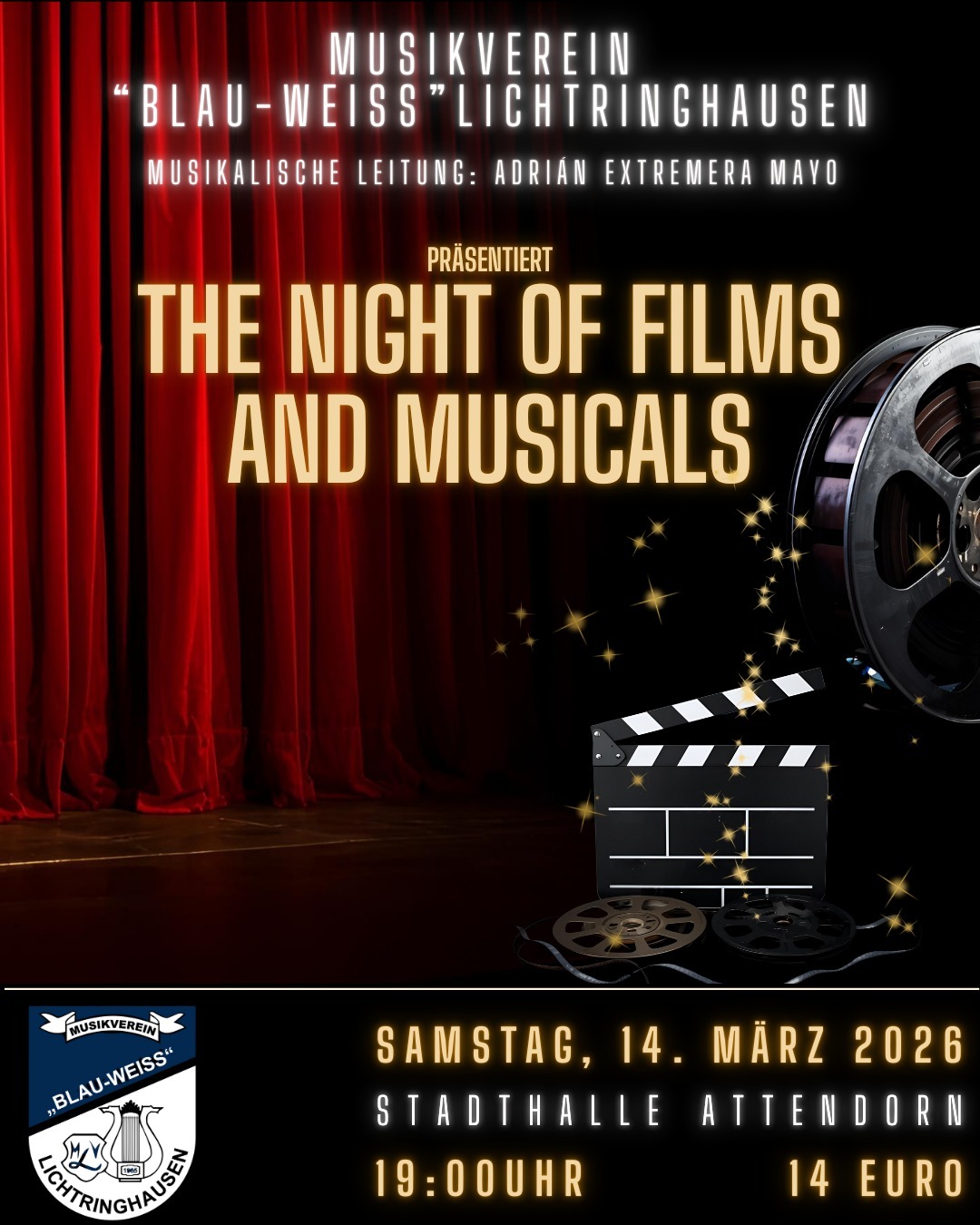 Der Musikverein „Blau-Weiss“ Lichtringhausen lädt zu einem besonderen Konzerterlebnis ein: The Night of Films and Musicals. Unter der musikalischen Leitung von Adrián Extremera Mayo erwartet das Publikum ein stimmungsvoller Abend mit bekannten Melodien aus der Film- und Musicalwelt.
